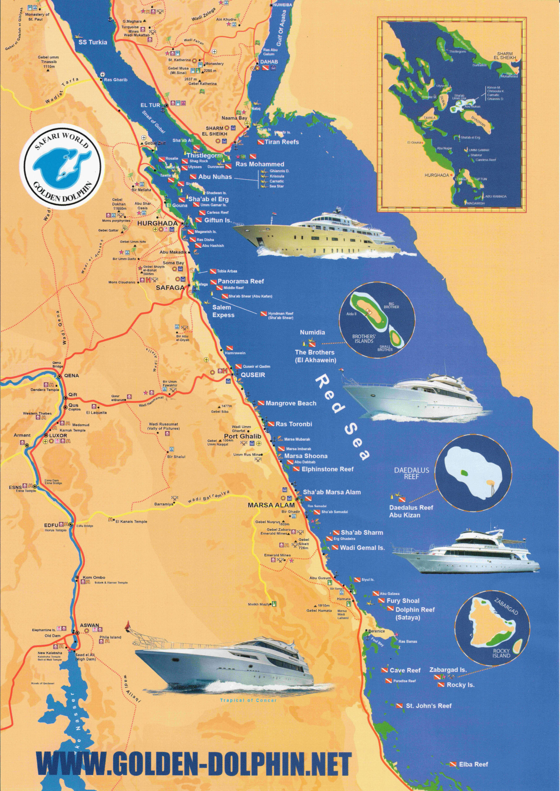 (Bateau pour la dernière nuit – aéroport de Port Ghalib = 10 minutes) - Du jeudi au mercredi midi, 5 jours et demi de croisière en pension complète sur le M/Y GOLDEN DOLPHIN 3, classe supérieure, bouteilles d’air 12 ou 15 litres et plombs, accès au Nitrox inclus. Bières, vins blancs, vins rosées et vins rouges, coca cola, sprit, eau minérale, thé, café. Nombre de plongées illimitées. (Possibilités de plonger selon le désir du groupe).